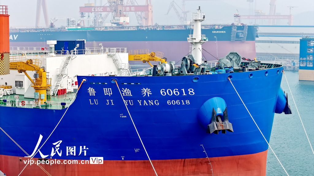 11月15日,由青岛国信集团投资建设的15万吨级智慧渔业养殖工船“国信1号2-2”在中国船舶集团青岛北海造船有限公司正式交付运营,命名为“鲁即渔养60618”。本次交付的养殖工船在投饲、取水等核心系统实现升级,将开展鲑鳟鱼工船全年连续养殖试验,构建从育苗到营销的全产业链模式。张进刚摄(人民图片网)