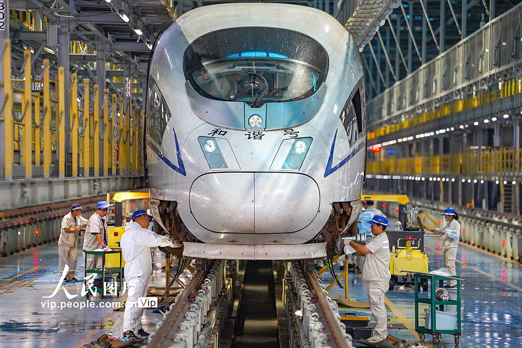 近日,中国铁路郑州局集团有限公司郑州动车段全面启动秋季整修工作,对配属的143列187.5标准组动车组进行系统检修与维护,切实提升设备质量,全力确保动车组运行安全,为中秋节、国庆节运输提供优质运力保障。崔轩豪摄(人民图片网)